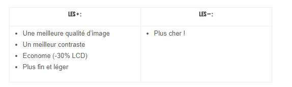 Contrairement à ce que l’on pourrait croire et/ou que l’on a cru jusqu’ici, les écrans LED ne sont pas une catégorie à part entière : Ils appartiennent eux-même aux écrans LCD ! LED signifie « ou Light-emitting Diode », soit un écran rétroéclairé par des diodes électroluminescentes. Ces diodes permettent de rétroéclairage de l’écran et permettent d’avoir un produit plus fin et moins encombrant, et un fini beaucoup plus contrasté qu’un écran LCD standard.